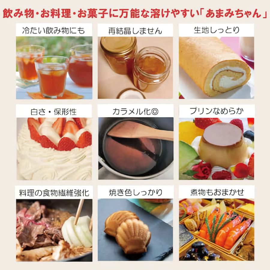 あまみちゃんには、砂糖のもつ「甘み」以外の「カラメル化」「保水性・保湿性」「溶けやすさ」もありますので、 料理・お菓子で使う砂糖を置き換えるだけ(同重量)で、簡単に低糖質の料理・お菓子を作ることができます。